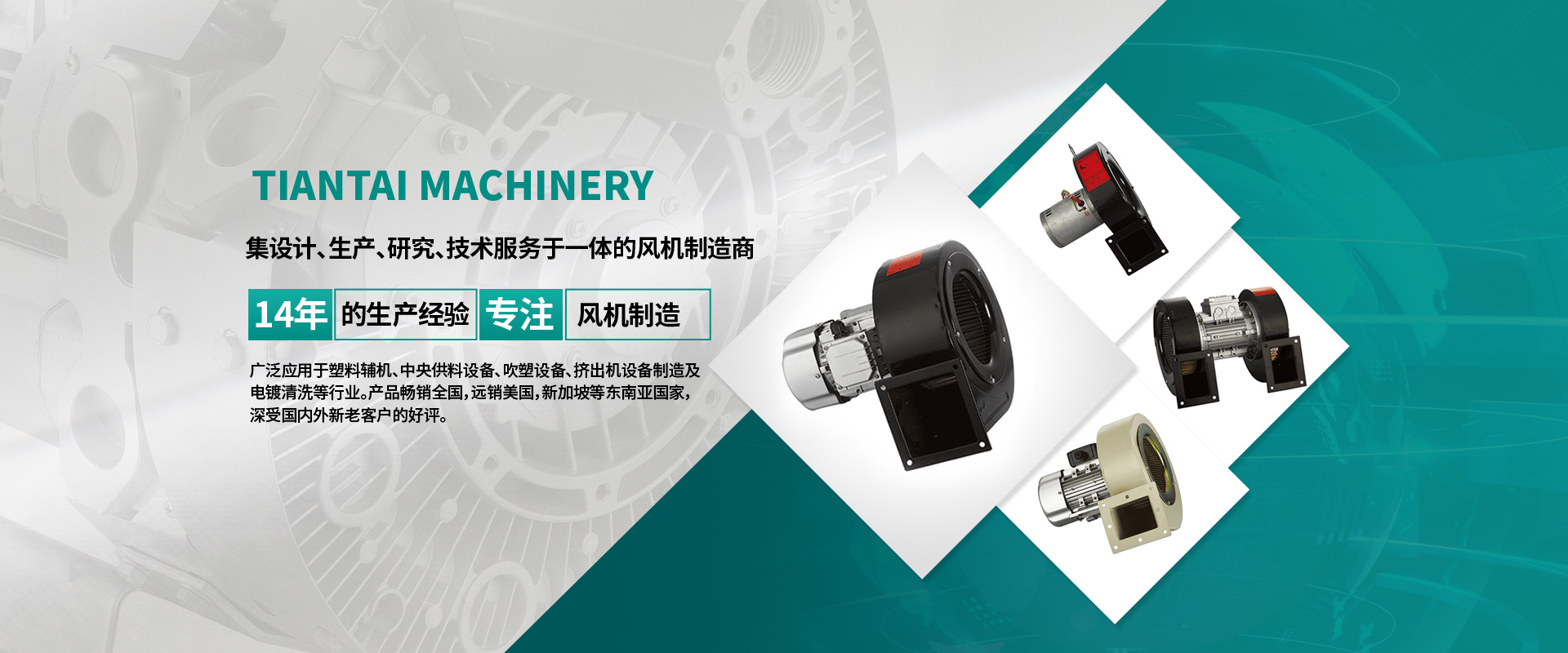 天泰機械有限公司自主開發(fā)生產(chǎn)的“TIANZELU”牌風(fēng)機廣泛應(yīng)用于塑料輔機、中央供料設(shè)備、吹塑設(shè)備、擠出機設(shè)備制造及電鍍清洗等行業(yè)。產(chǎn)品暢銷全國,遠銷美國,新加坡等東南亞國家,深受國內(nèi)外新老客戶的好評。